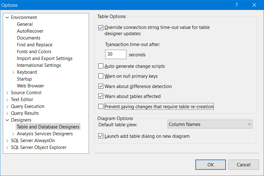 Go to Options > Table and Database Designers > Prevent saving changes that require table re-creation1